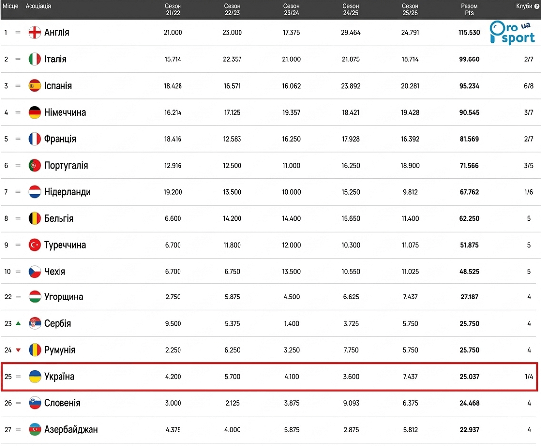 Варто зауважити, що поза межами топ-11 таблиці коефіцієнтів УЄФА Україна залишається єдиною асоціацією в рейтингу, яка все ще має як мінімум одного представника в єврокубках.