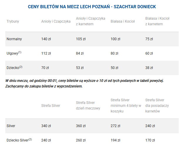 Найдорожчий квиток у Срібну ложу, придбаний в день матчу, коштуватиме 360 злотих (85 євро). Найдешевший пільговий дорослий за умови наявності сезонного абонементу – 60 злотих (14 євро).