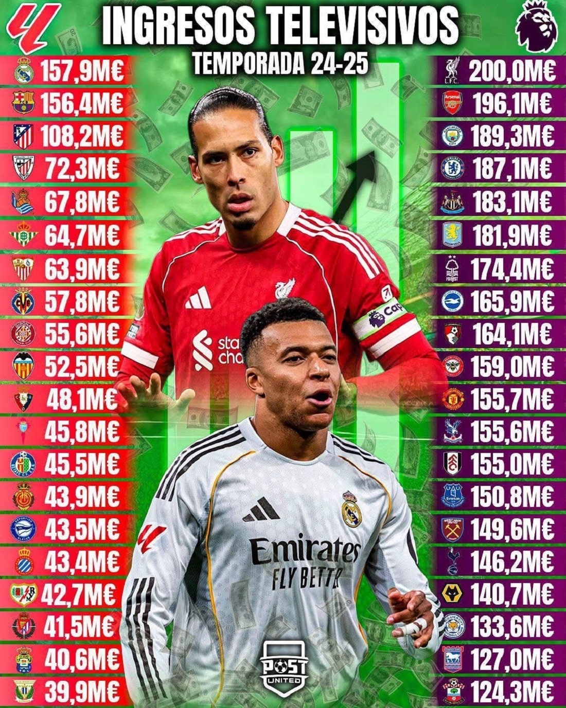 Згідно з опублікованими даними, клуби АПЛ отримують від 124 до 200 млн євро, тоді як показники команд Ла Ліги коливаються в межах приблизно 40—158 млн євро.