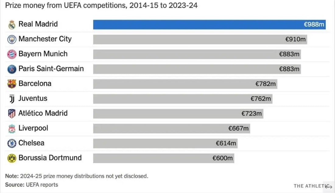 Авторитетне світове видання The Athletic оприлюднило рейтинг футбольних клубів за заробленими призовими в єврокубках у період з 2014-го по 2024 роки.
