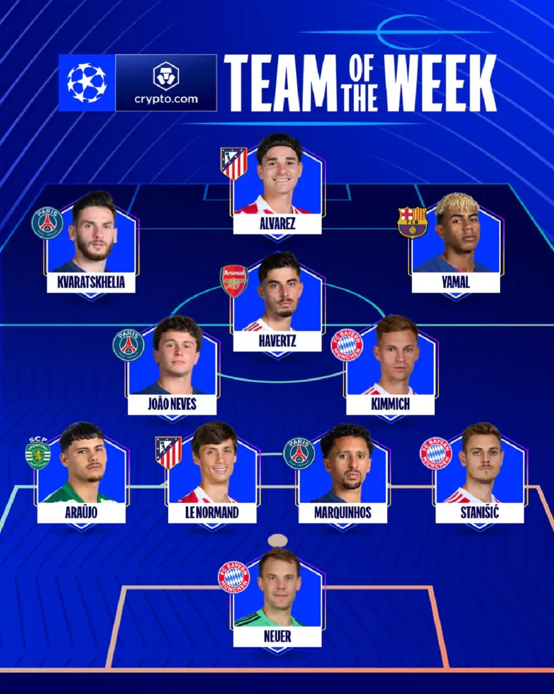 Мануель Ноєр (Баварія): 40-річний голкіпер продемонстрував досвід, холоднокровність та клас у переможній грі Баварії проти Реала. Він виграв дуель нервів у протистоянні віч-на-віч із Вінісіусом Жуніором та здійснив блискучий сейв після удару Кіліана Мбаппе.