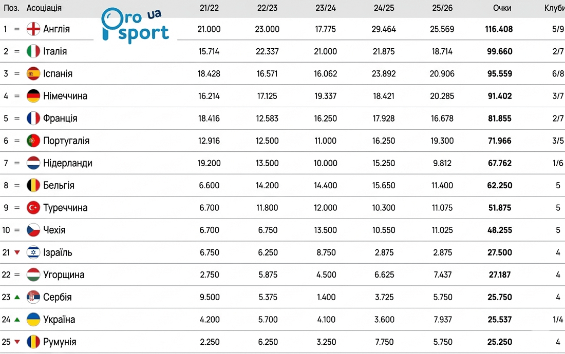 Наразі наша асоціація, обійшовши Румунію, посідає 24-ту позицію. Варто зауважити, що поза межами топ-11 таблиці коефіцієнтів УЄФА Україна залишається єдиною в рейтингу, яка все ще має як мінімум одного представника в єврокубках.