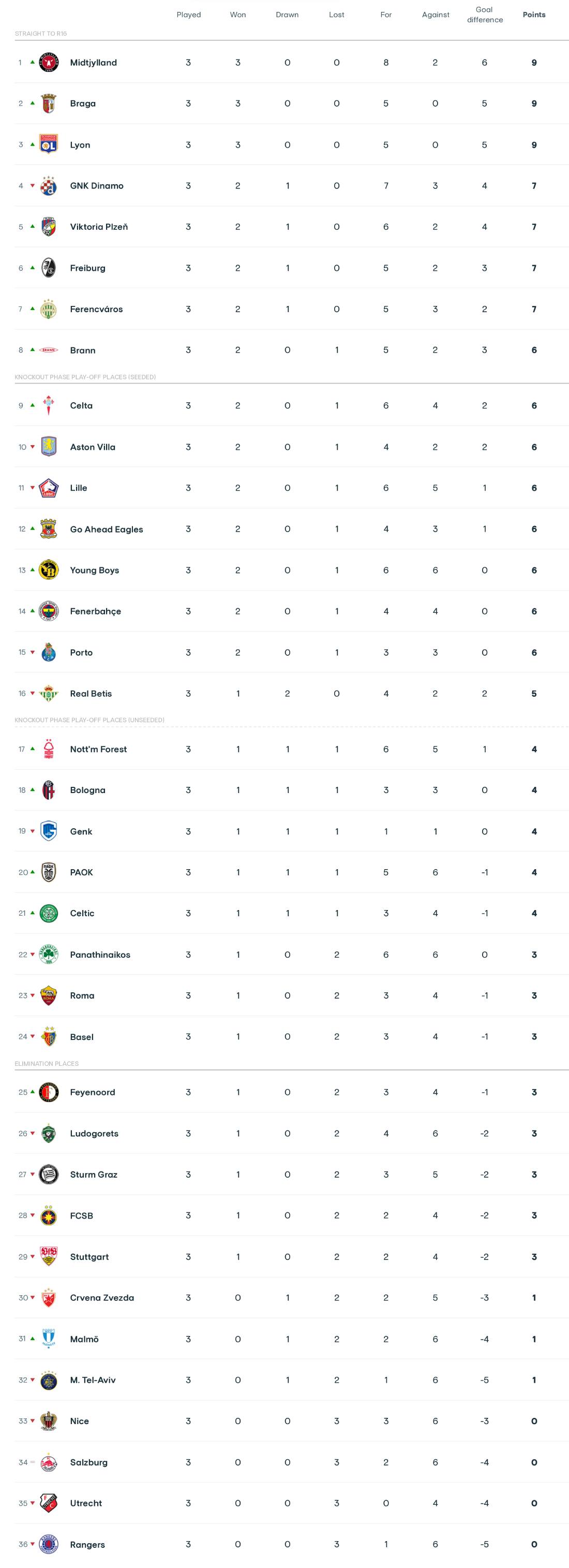 Максимальний очковий доробок мають датський Мідтьюллан, португальська Брага та французький Ліон.