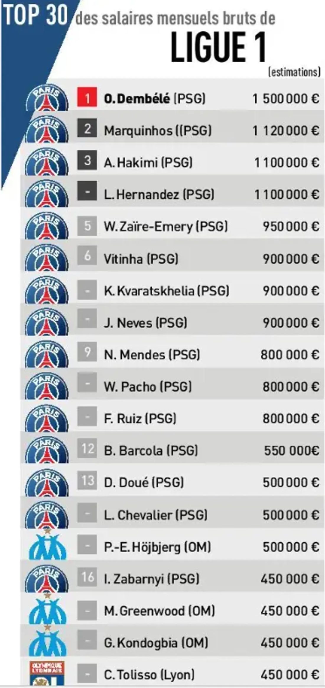 Реєстр очолив чинний володар Золотого м’яча, нападник ПСЖ Усман Дембеле, якому клуб платить 1,5 млн євро на місяць. На другому місці опинився капітан парижан Маркіньос (1,12 млн), а бронзу розділили захисники ПСЖ Ашраф Хакімі та Люка Ернандес (по 1,1 млн євро кожен).