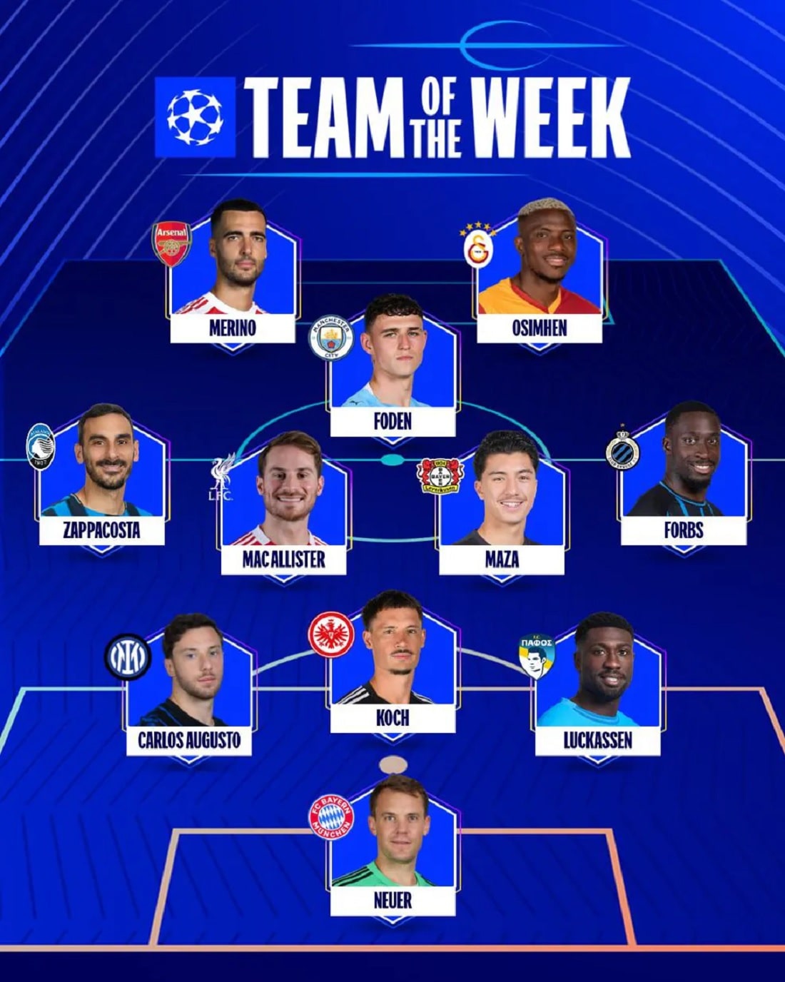 Мануель Ноєр (Баварія) — Деррік Лускассен (Пафос), Робін Кох (Айнтрахт), Карлос Аугусто (Інтер) — Карлос Форбс (Брюгге), Ібрагім Маза (Баєр), Алексіс Макалістер (Ліверпуль), Давіде Дзапппакоста (Аталанта), Філ Фоден (Манчестер Сіті) — Віктор Осімхен (Галатасарай), Мікель Меріно (Арсенал).