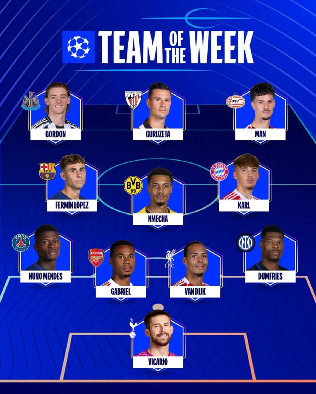 Гульєрмо Вікаріо (Тоттенгем) — Дензел Дюмфріс (Інтер), Вірджіл ван Дайк (Ліверпуль), Габріел (Арсенал), Нуну Мендеш (ПСЖ) — Леннарт Карл (Баварія), Фелікс Нмеча (Боруссія Д), Фермін Лопес (Барселона) — Денніс Ман (ПСВ), Горка Гурусета (Атлетік), Ентоні Гордон (Ньюкасл).