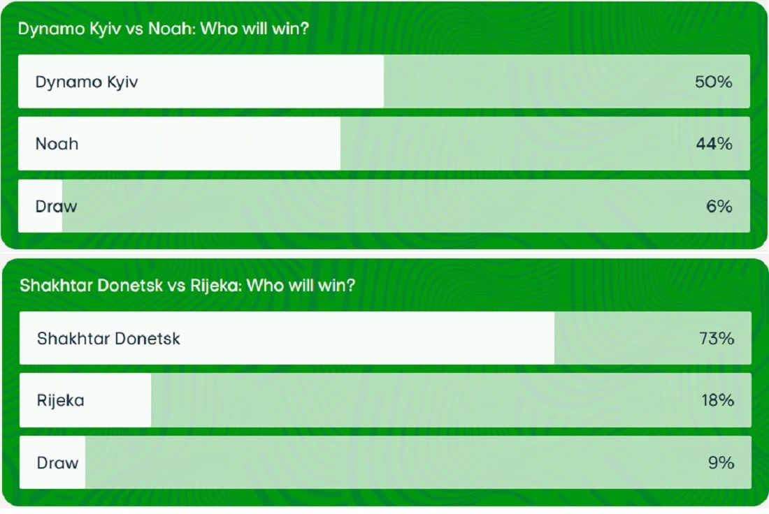 50% респондентів упевнені, що у матчі Динамо — Ноа (22:00) перемогу здобудуть українці. 44% переконані, що виграє вірменський клуб, а ще 6% не сумніваються, що у Любліні буде зафіксовано нічию.