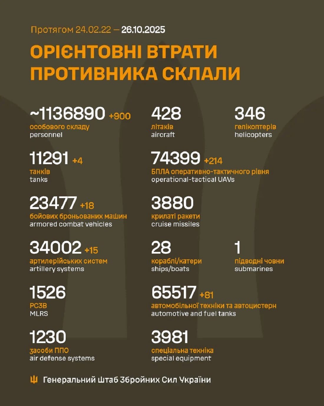 Вже мінус 1 136 890: Генштаб ЗСУ назвав свіжі дані втрат загарбників за час їхнього вторгнення в Україну