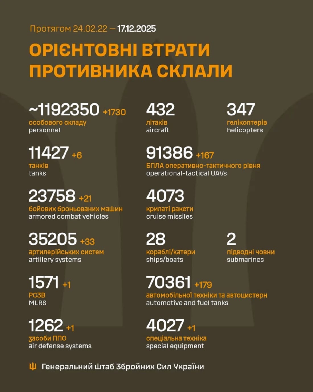 Вже мінус 1 192 350: Генштаб ЗСУ назвав свіжі дані втрат загарбників за час їхнього вторгнення в Україну
