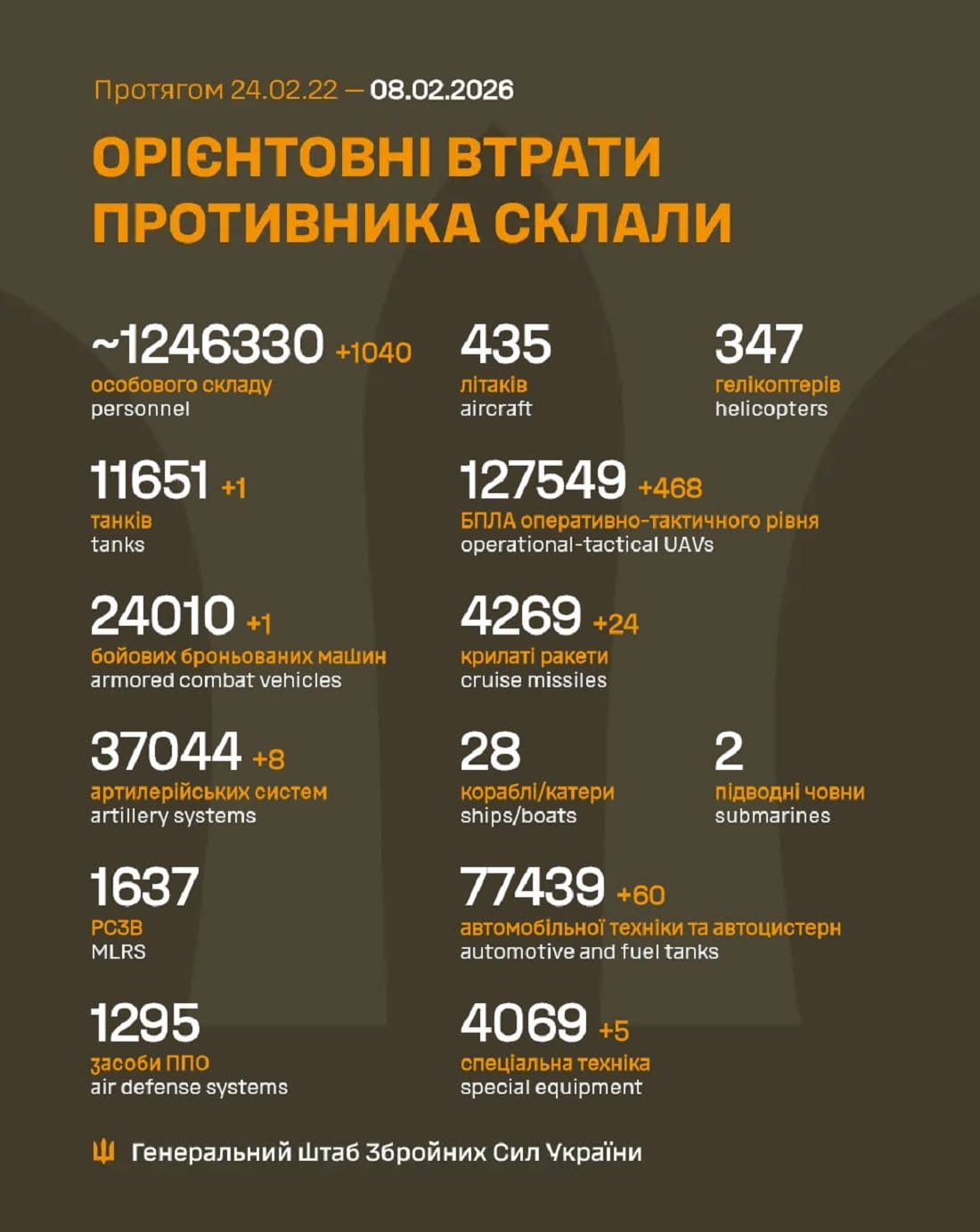 Вже мінус 1 246 330 : Генштаб ЗСУ назвав свіжі дані втрат загарбників за час їхнього вторгнення в Україну