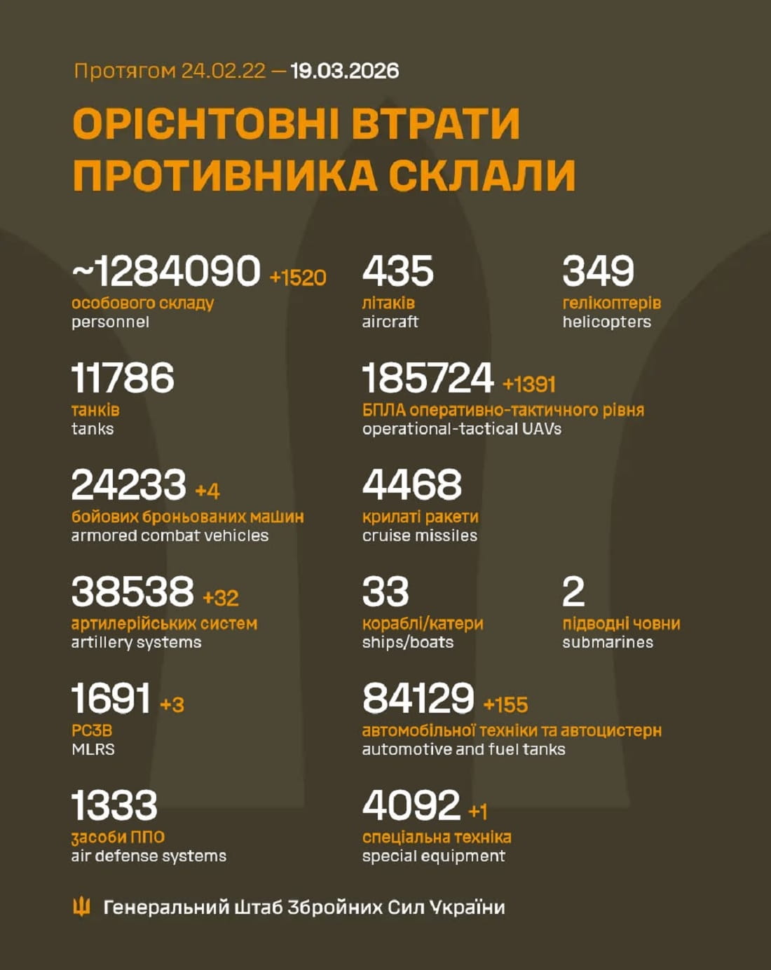 Вже мінус 1 284 090: Генштаб ЗСУ назвав свіжі дані втрат загарбників за час їхнього вторгнення в Україну